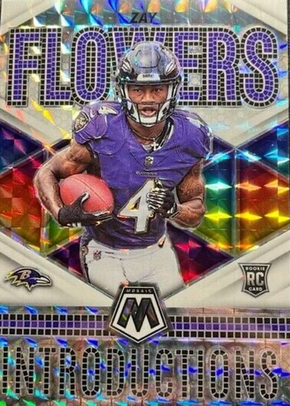 The Zay Flowers 2023 Mosaic #I-8 Introductions - White /25 Rookie card in Raw condition has not changed in price in the last 30 days and was last sold for $41.00 .