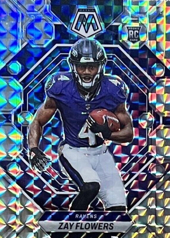 The Zay Flowers 2023 Mosaic #380 Mosaic Rookie card in Raw condition has moved up $0.26 (+26.3%) in the last 30 days and was last sold for $1.25 .