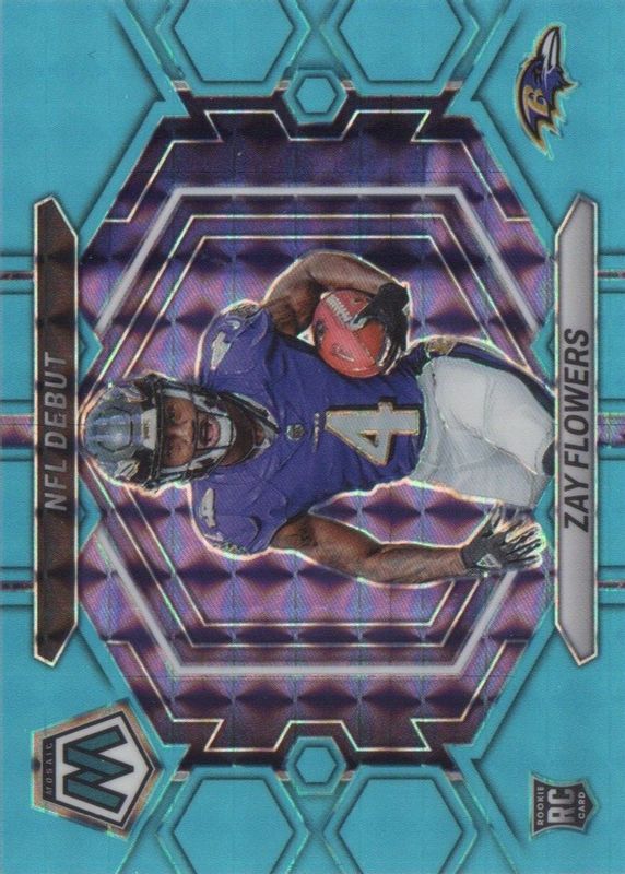 The Zay Flowers 2023 Mosaic #ND-18 NFL Debut - Blue Fluorescent /15 Rookie card in Raw condition has not changed in price in the last 30 days and was last sold for $50.00 .