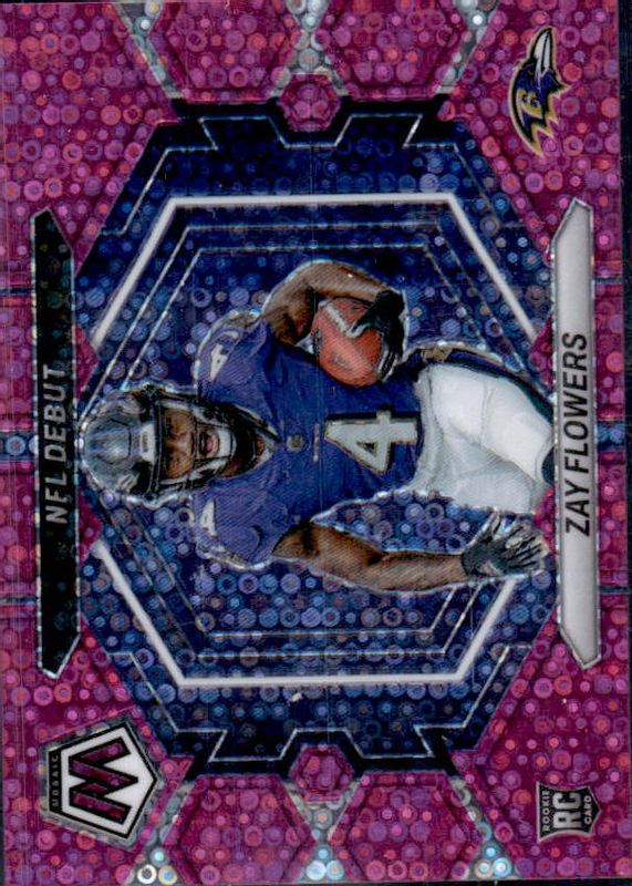 The Zay Flowers 2023 Mosaic #ND-18 NFL Debut - No Huddle Pink /20 Rookie card in Raw condition has not changed in price in the last 30 days and was last sold for $40.00 .