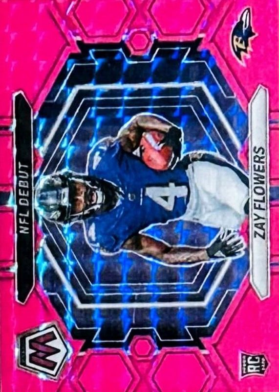 The Zay Flowers 2023 Mosaic #ND-18 NFL Debut - Pink Fluorescent /10 Rookie card in Raw condition has not changed in price in the last 30 days and was last sold for $200.00 .