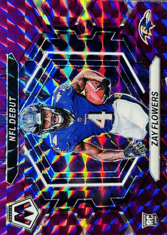 The Zay Flowers 2023 Mosaic #ND-18 NFL Debut - Purple /49 Rookie card in Raw condition has not changed in price in the last 30 days and was last sold for $9.00 .