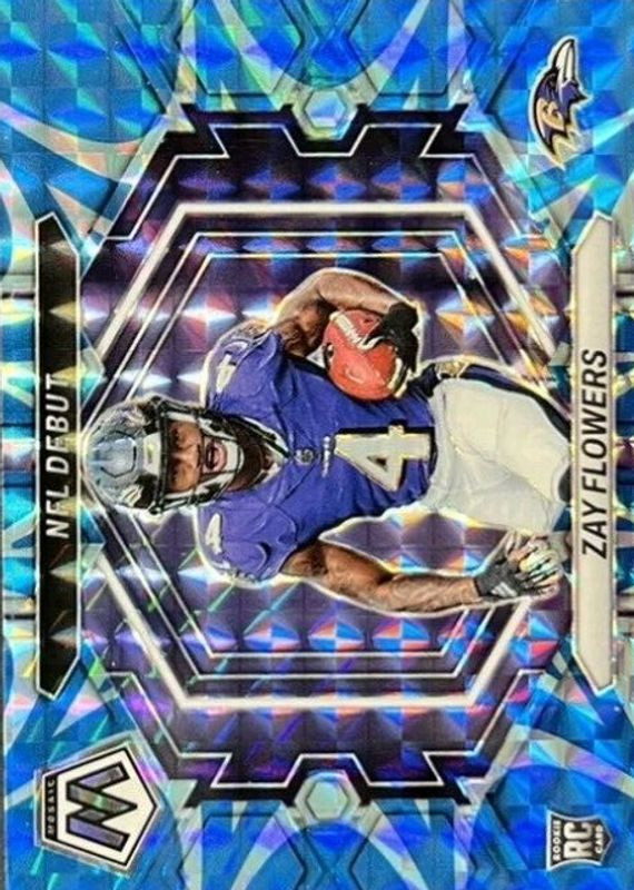 The Zay Flowers 2023 Mosaic #ND-18 NFL Debut - Reactive Blue Rookie card in Raw condition has moved down -$0.60 (-32.4%) in the last 30 days and was last sold for $1.25 .