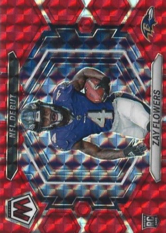 The Zay Flowers 2023 Mosaic #ND-18 NFL Debut - Red Rookie card in Raw condition has moved up $0.47 (+22.9%) in the last 30 days and was last sold for $2.52 .