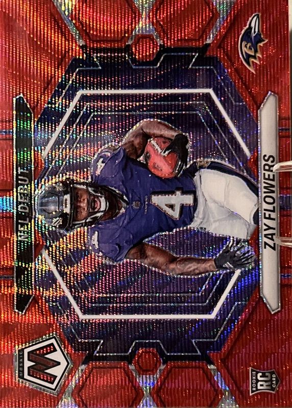 The Zay Flowers 2023 Mosaic #ND-18 NFL Debut - Red Wave /9 Rookie card in Raw condition has not changed in price in the last 30 days and was last sold for $90.00 .