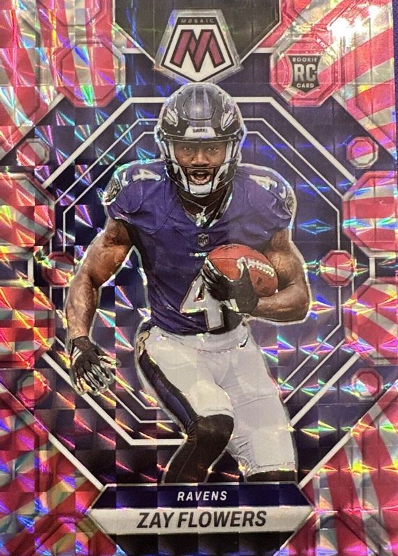 This card is 1 of 107 Zay Flowers' card variations in the 2023 Mosaic set being tracked by Sports Card Investor, including Base, NFL Debut, Choice Red & Green, Green, and Mosaic.