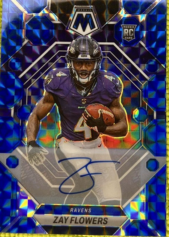 The Zay Flowers 2023 Mosaic #380 Rookie Autographs - Blue (/99) card in Raw condition has not changed in price in the last 30 days and was last sold for $53.00 .