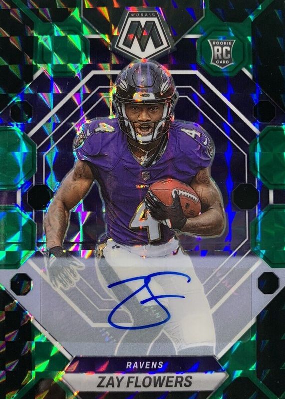 The Zay Flowers 2023 Mosaic #380 Rookie Autographs - Choice Fusion Green & Black /25 card in Raw condition has not changed in price in the last 30 days and was last sold for $150.00 .