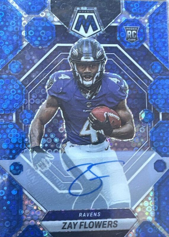The Zay Flowers 2023 Mosaic #380 Rookie Autographs - No Huddle Blue card in Raw condition has not changed in price in the last 30 days and was last sold for $46.00 .