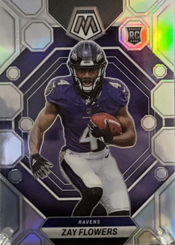 The Zay Flowers 2023 Mosaic #380 Silver Rookie card in Raw condition has moved down -$0.75 (-42.9%) in the last 30 days and was last sold for $1.00 .