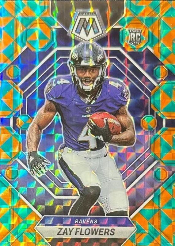 This card is 1 of 107 Zay Flowers' card variations in the 2023 Mosaic set being tracked by Sports Card Investor, including Base, NFL Debut, Choice Red & Green, Green, and Mosaic.