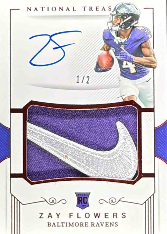 The Zay Flowers 2023 National Treasures #CRPA-ZFL Crossover Rookie Patch Autographs - Brand Logo /2 card in Raw condition has not changed in price in the last 30 days and was last sold for $680.00 .