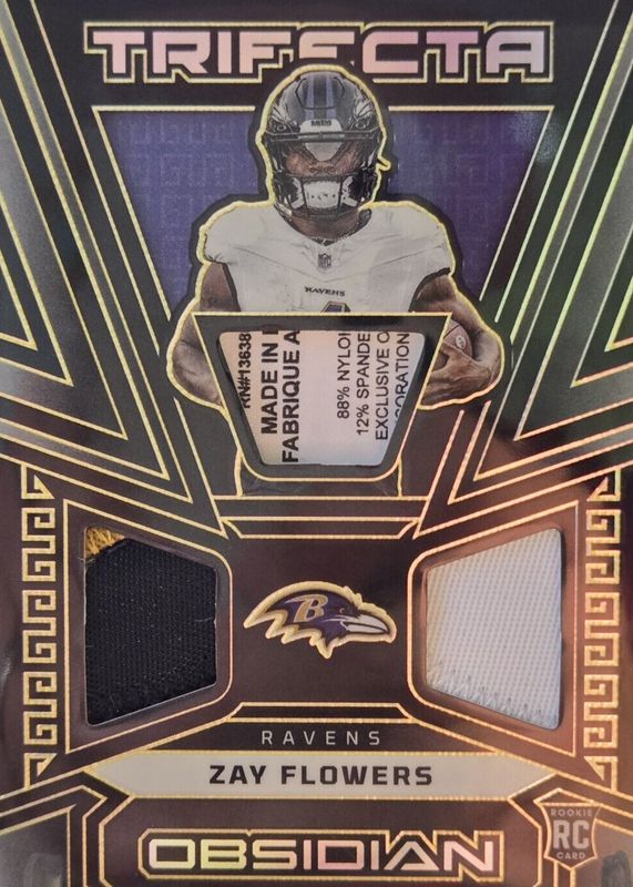 The Zay Flowers 2023 Obsidian #107 Electric Etch Yellow /10 Rookie card in Raw condition has not changed in price in the last 30 days and was last sold for $30.00 .