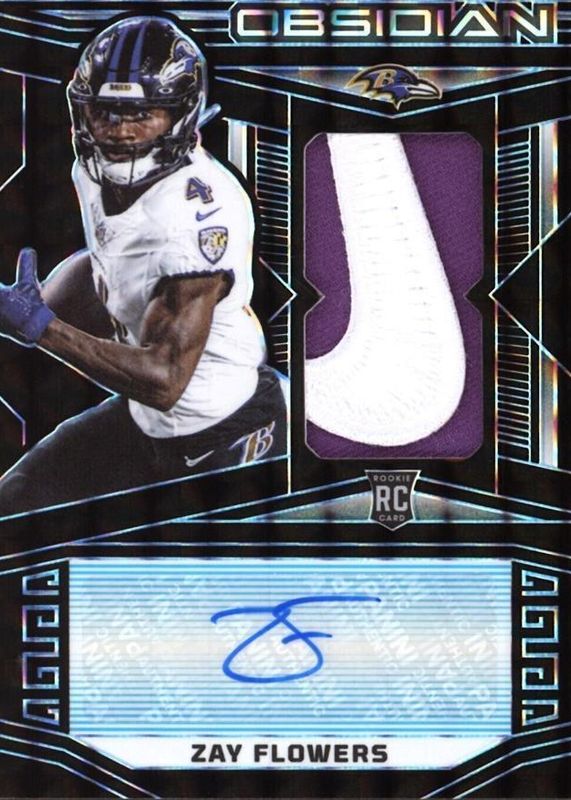 The Zay Flowers 2023 Obsidian #239 Rookie Jersey Autographs - Electric Etch Blue Finite /1 card in Raw condition has not changed in price in the last 30 days and was last sold for $610.00 .