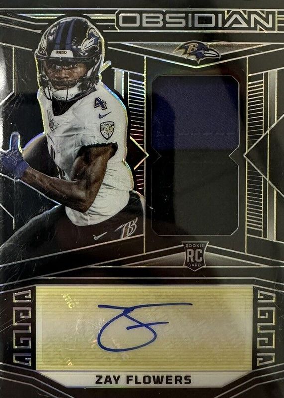 The Zay Flowers 2023 Obsidian #239 Rookie Jersey Autographs - Electric Etch Yellow /10 card in Raw condition has not changed in price in the last 30 days and was last sold for $75.00 .