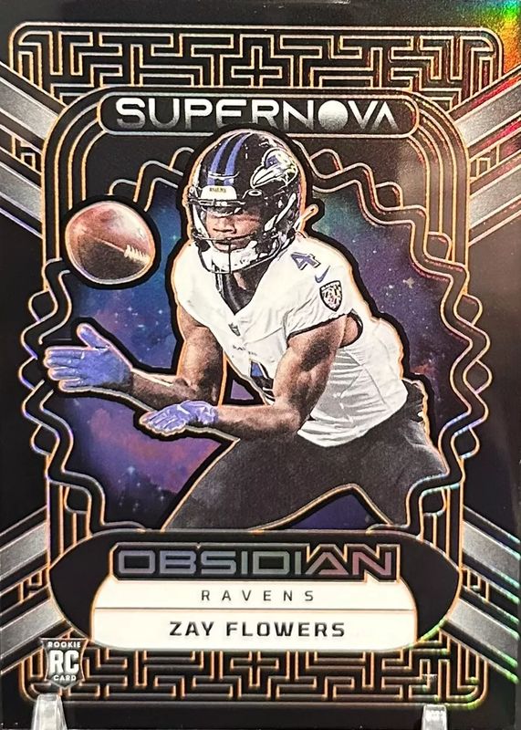The Zay Flowers 2023 Obsidian #18 Supernova - Electric Etch Orange /65 Rookie card in Raw condition has not changed in price in the last 30 days and was last sold for $15.50 .