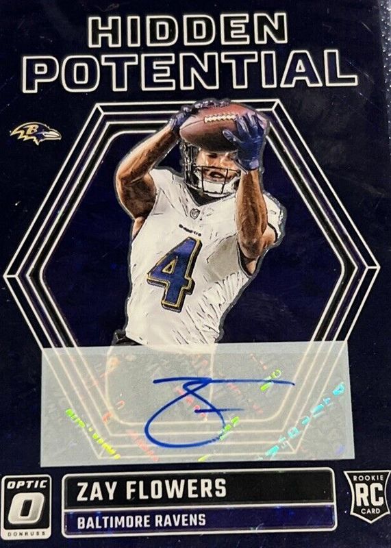 The Zay Flowers 2023 Optic #HP-ZF Hidden Potential Autographs - Purple Stars /25 Rookie card in Raw condition has not changed in price in the last 30 days and was last sold for $33.00 .