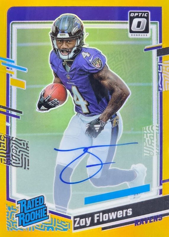 The Zay Flowers 2023 Optic #210 Rated Rookie Autographs - Gold /10 card in Raw condition has not changed in price in the last 30 days and was last sold for $355.00 .