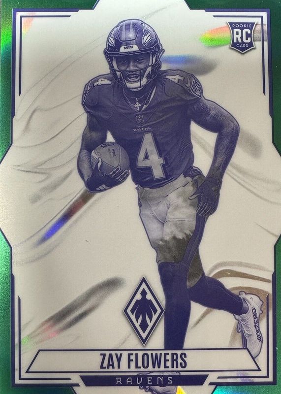 The Zay Flowers 2023 Phoenix #CON-12 Contours - Green /25 Rookie card in Raw condition has not changed in price in the last 30 days and was last sold for $39.99 .