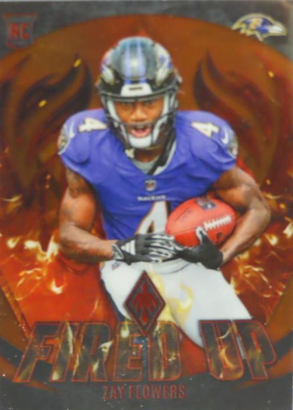 The Zay Flowers 2023 Phoenix #FU-16 Fired Up - Orange /75 Rookie card in Raw condition has not changed in price in the last 30 days and was last sold for $6.00 .
