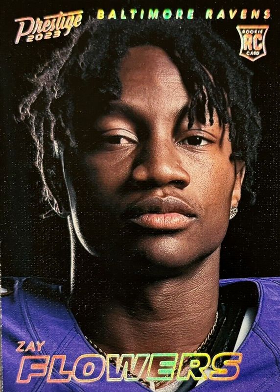 The Zay Flowers 2023 Prestige #RP-9 Rookie Portraits /(SSP) card in Raw condition has not changed in price in the last 30 days and was last sold for $21.00 .