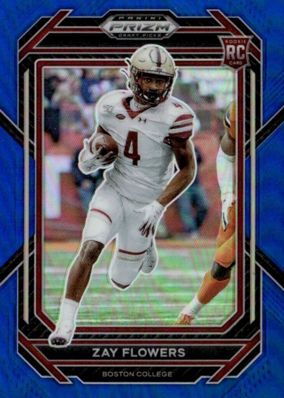 The Zay Flowers 2023 Prizm Draft Picks #143 Blue /199 Rookie card in Raw condition has moved down -$0.78 (-28.4%) in the last 30 days and was last sold for $1.97 .