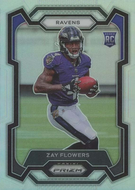 The Zay Flowers 2023 Prizm #307 Silver Rookie card in Raw condition has moved up $19.00 (+950%) in the last 30 days and was last sold for $21.00 .