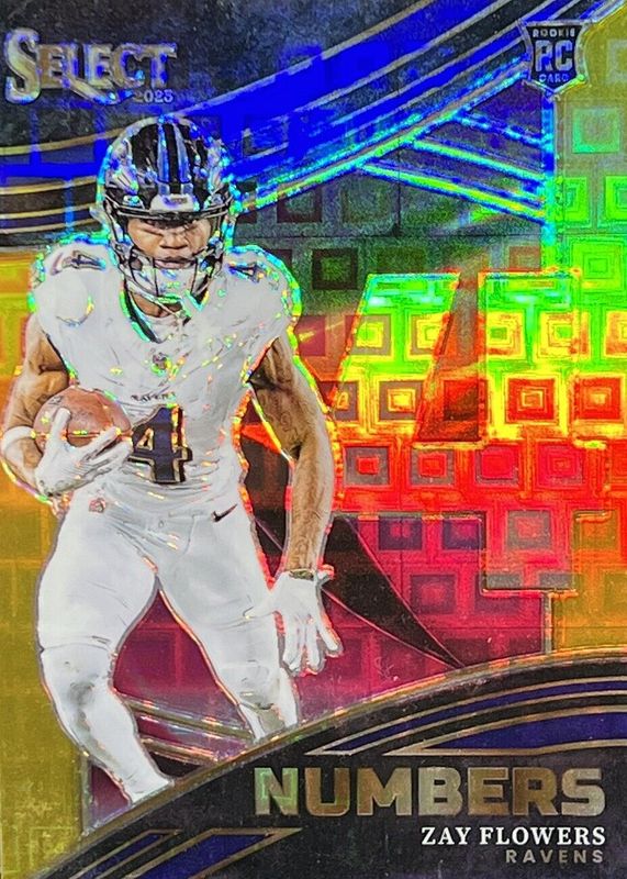 The Zay Flowers 2023 Select #NMB-ZFL Select Numbers - Gold /10 Rookie card in Raw condition has not changed in price in the last 30 days and was last sold for $46.00 .