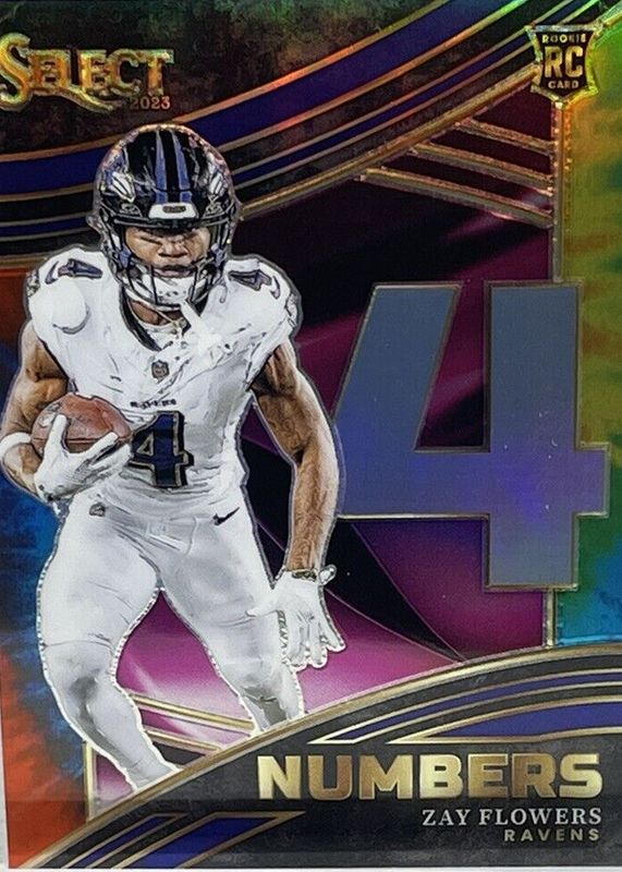 The Zay Flowers 2023 Select #NMB-ZFL Select Numbers - Tie-Dye /25 Rookie card in Raw condition has not changed in price in the last 30 days and was last sold for $40.00 .