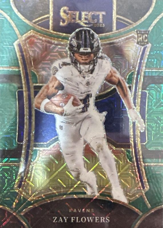 The Zay Flowers 2023 Select #408 Suite Level Green /5 Rookie card in Raw condition has not changed in price in the last 30 days and was last sold for $150.00 .