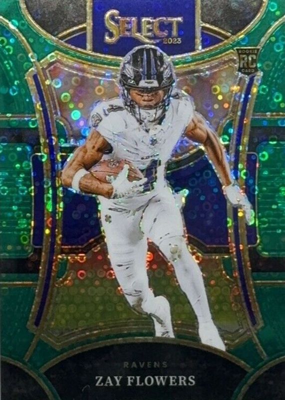 The Zay Flowers 2023 Select #408 Suite Level Green Disco /5 Rookie card in Raw condition has not changed in price in the last 30 days and was last sold for $109.50 .