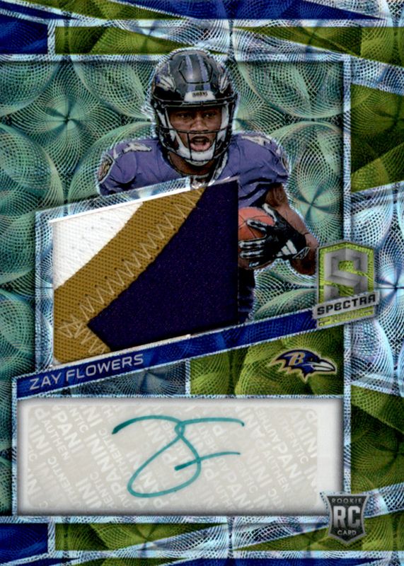 The Zay Flowers 2023 Spectra #242 Rookie Patch Auto - Neon Green /35 card in Raw condition has not changed in price in the last 30 days and was last sold for $86.79 .