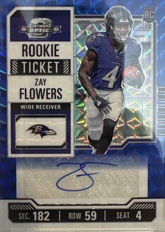 The Zay Flowers 2023 Zenith #104 Contenders Optic Rookie Ticket Auto Preview - Blue /23 (Ball at Side) card in Raw condition has not changed in price in the last 30 days and was last sold for $75.00 .