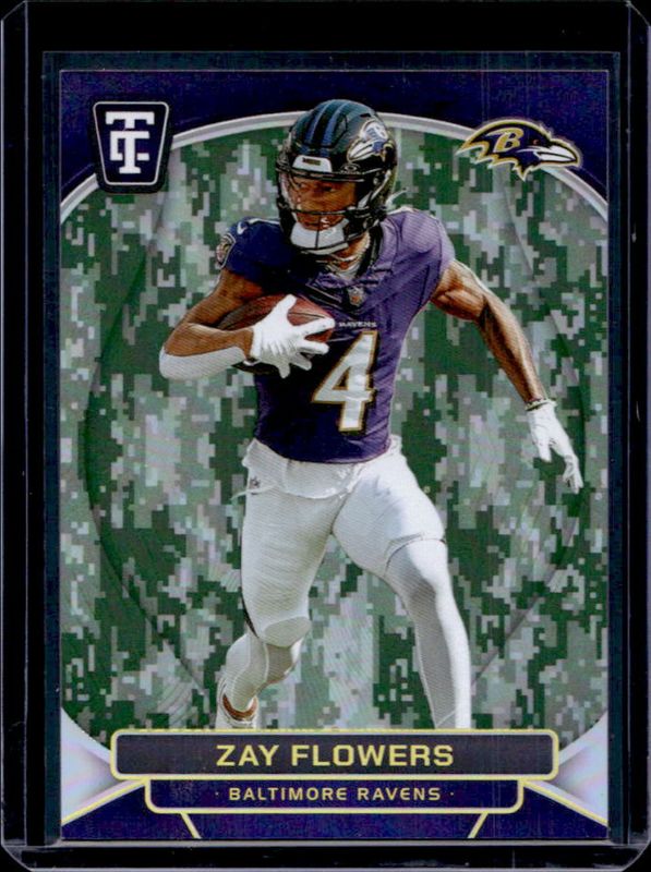 The Zay Flowers 2024 Totally Certified #9 Mirror Platinum Camo /35 card is 1 of 35 Zay Flowers' card variations in the 2024 Totally Certified set being tracked by Sports Card Investor, including Base, Mirror, Mirror Bronze, Mirror Maroon, and Mirror Purple.