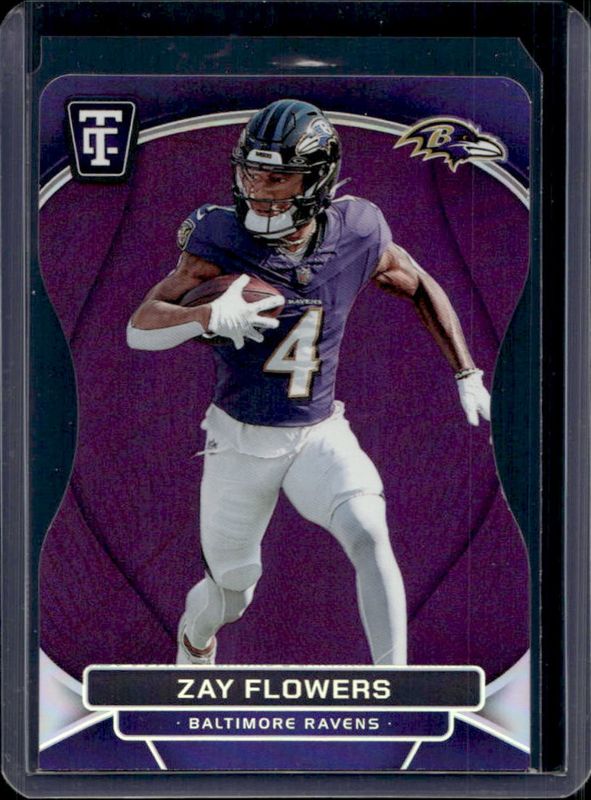 The Zay Flowers 2024 Totally Certified #9 Mirror Platinum Purple Die-Cut /75 card is 1 of 35 Zay Flowers' card variations in the 2024 Totally Certified set being tracked by Sports Card Investor, including Base, Mirror, Mirror Bronze, Mirror Maroon, and Mirror Purple.