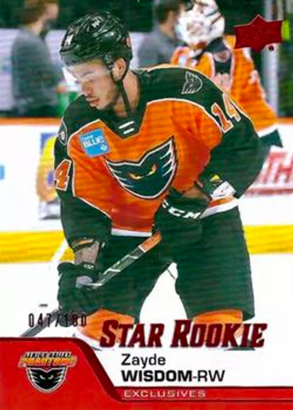 The Zayde Wisdom 2020 Upper Deck AHL #165 UD Exclusives /100 card is 1 of 12 Zayde Wisdom's card variations in the 2020 Upper Deck AHL set being tracked by Sports Card Investor, including #165 Base, #232 Base, #232 Red, #232 Gold /25, and #165 UD High Gloss /10.
