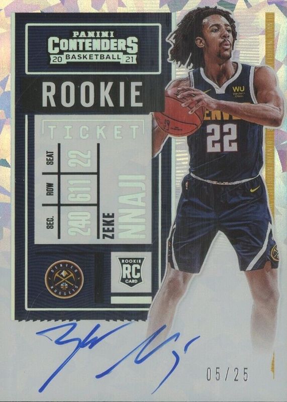 This card is 1 of 28 Zeke Nnaji's card variations in the 2020 Contenders set being tracked by Sports Card Investor, including Rookie Ticket Auto (Blue Jersey), Rookie Ticket Auto - Clear Ticket (Blue Jersey), Rookie Ticket Auto - Premium (Blue Jersey), Rookie Ticket Auto - Premium Green Shimmer (Blue Jersey), and Rookie Ticket Auto - Ticket Stub (/22 - Blue Jersey).