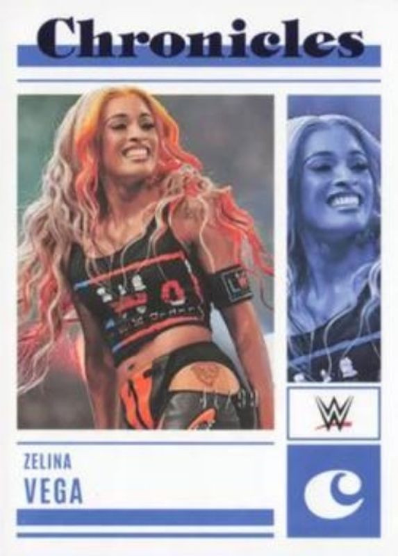 The Zelina Vega 2023 Chronicles WWE #90 Blue /99 card is 1 of 59 Zelina Vega's card variations in the 2023 Chronicles WWE set being tracked by Sports Card Investor, including #371 Base, #90 Base, #243 Base, #243 Bronze, and #90 Bronze.