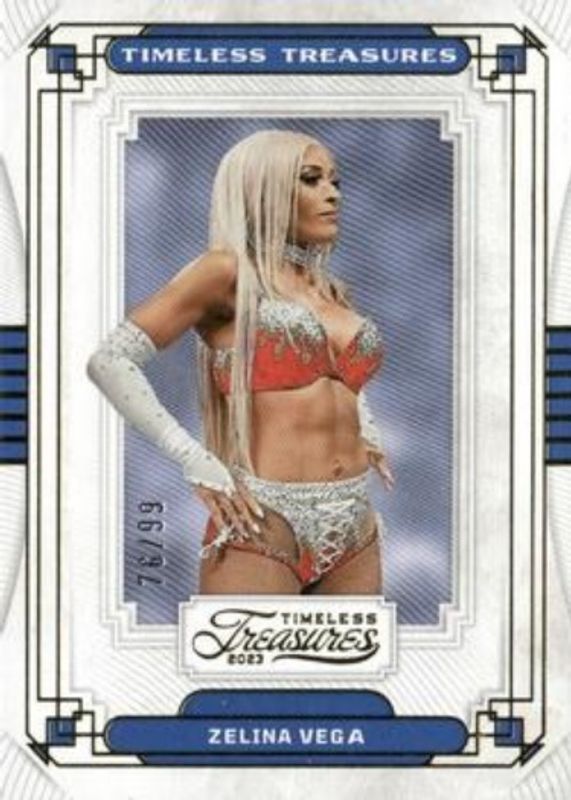 The Zelina Vega 2023 Chronicles WWE #TT-22 Timeless Treasures /99 card is 1 of 59 Zelina Vega's card variations in the 2023 Chronicles WWE set being tracked by Sports Card Investor, including #371 Base, #90 Base, #243 Base, #243 Bronze, and #90 Bronze.