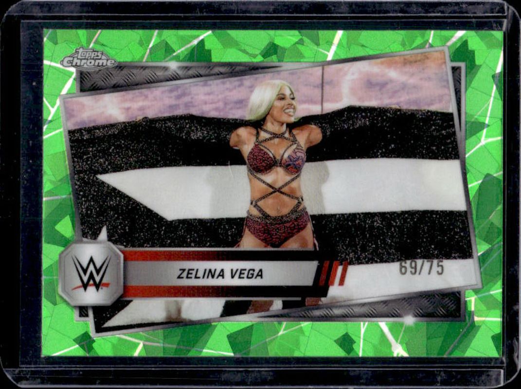 The Zelina Vega 2025 Topps Chrome WWE Sapphire Edition #196 Base Chrome - Green Refractor /75 card is 1 of 11 Zelina Vega's card variations in the 2025 Topps Chrome WWE Sapphire Edition set being tracked by Sports Card Investor, including Base Chrome, Red Brand Autographs, Base Chrome - Gold Refractor /50, Base Chrome - Orange Refractor /25, and Red Brand Autographs - Orange Refractor /25.