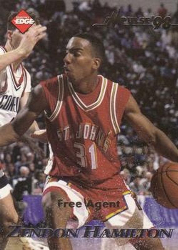The Zendon Hamilton 1998 Collector's Edge Impulse #24 Base card is 1 of 8 Zendon Hamilton's card variations in the 1998 Collector's Edge Impulse set being tracked by Sports Card Investor, including Jersey City '99, Thick, Jersey City '99 Gold /5000, Jersey City '99 SN50 /50, and Pro Signatures.