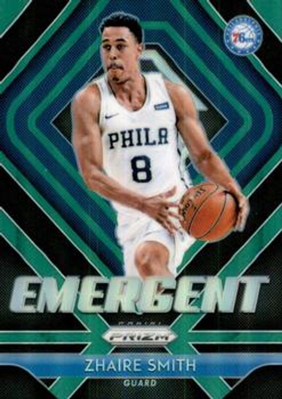 The Zhaire Smith 2018 Prizm #16 Emergent - Green Rookie card is 1 of 47 Zhaire Smith's card variations in the 2018 Prizm set being tracked by Sports Card Investor, including Base, Choice Blue Yellow Green, Fast Break, Green, and Pink Ice.