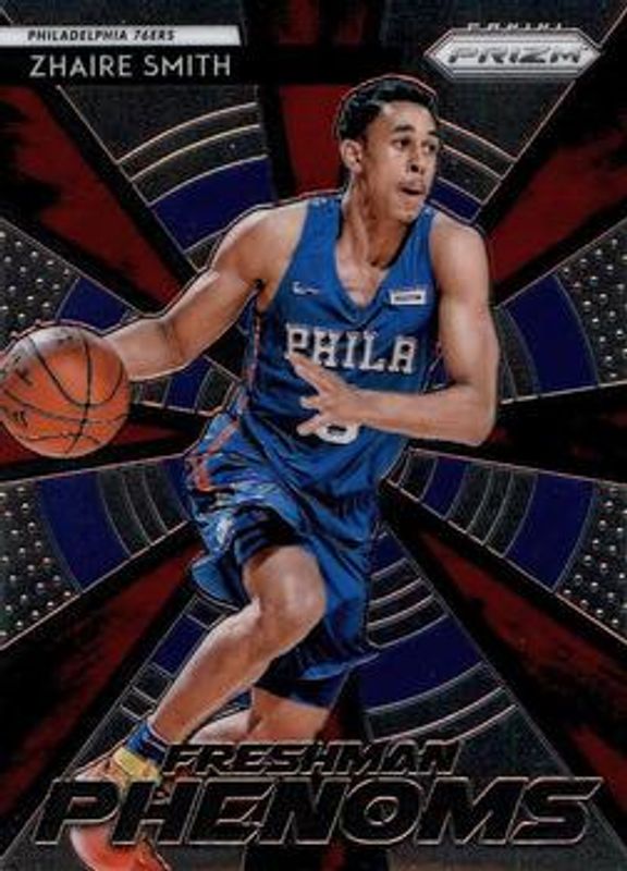 The Zhaire Smith 2018 Prizm #10 Freshman Phenoms Rookie card is 1 of 47 Zhaire Smith's card variations in the 2018 Prizm set being tracked by Sports Card Investor, including Base, Choice Blue Yellow Green, Fast Break, Green, and Pink Ice.