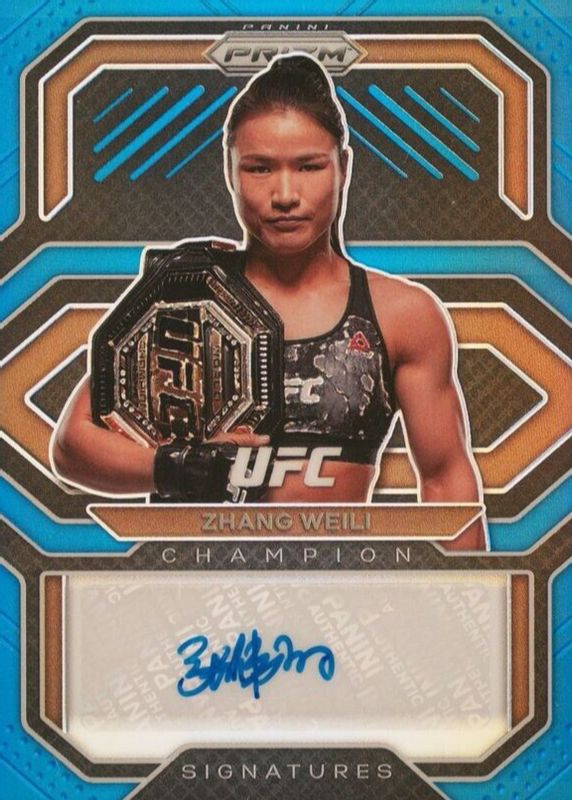 The Zhang Weili 2021 Prizm UFC #CS-ZWL Champion Signatures - Blue /35 card in Raw condition has not changed in price in the last 30 days and was last sold for $320.00 .