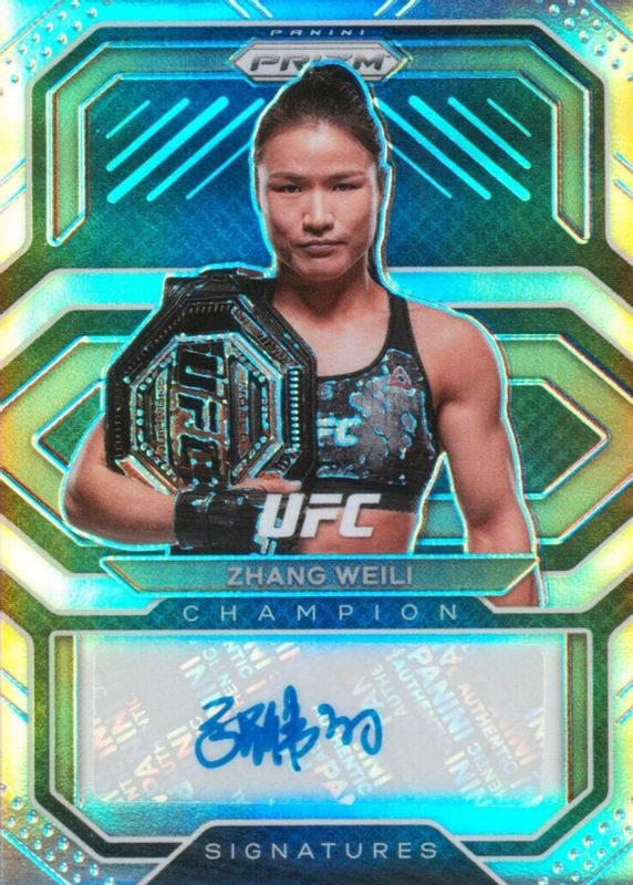 The Zhang Weili 2021 Prizm UFC #CS-ZWL Champion Signatures - Silver card in Raw condition has not changed in price in the last 30 days and was last sold for $208.41 .