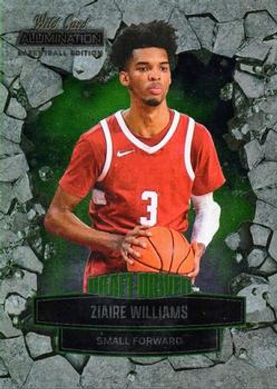 The Ziaire Williams 2021 Wild Card Alumination #DD-50 Draft Driven Green Rookie card is 1 of 494 Ziaire Williams' card variations in the 2021 Wild Card Alumination set being tracked by Sports Card Investor, including Base, 100 Stripe, 10 Stripe, 20 Stripe, and 50 Stripe.
