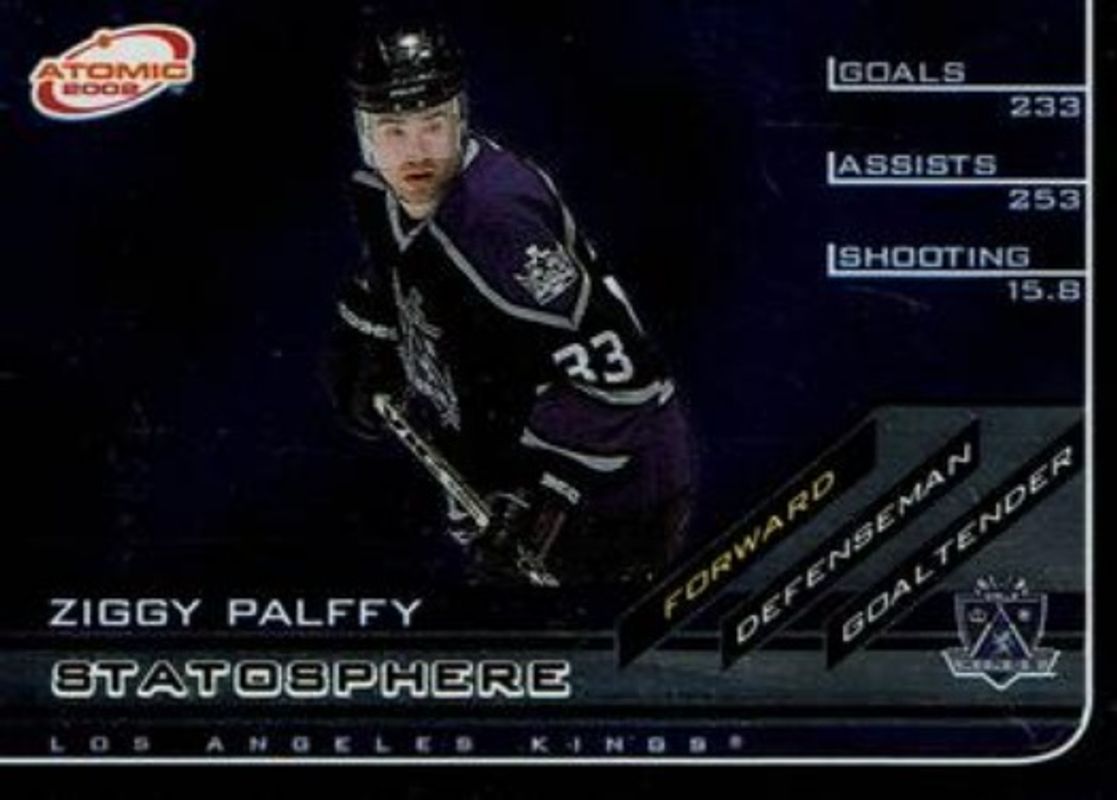 The Ziggy Palffy 2001 Pacific Atomic #15 Statosphere card is 1 of 8 Ziggy Palffy's card variations in the 2001 Pacific Atomic set being tracked by Sports Card Investor, including Base /500, Red /290, Gold /200, Premiere Date /90, and Blue /9.
