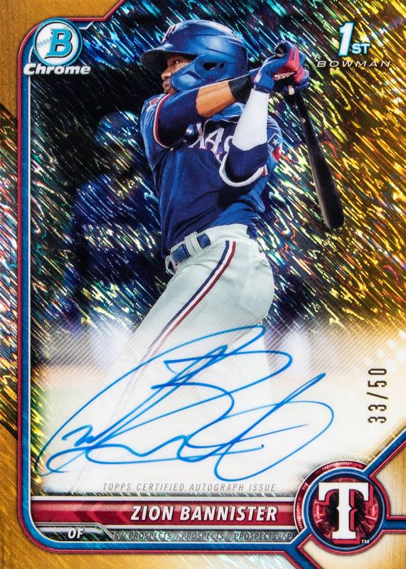 Best Prices Available For Sale of Zion Bannister 2022 Bowman #CPA-ZB Chrome Prospect Auto - Gold Shimmer Refractor /50 (1st)