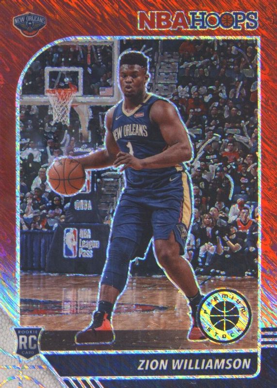The Zion Williamson 2019 Hoops Premium Stock #258 Red Shimmer /88 Rookie card in Raw condition has not changed in price in the last 30 days and was last sold for $50.00 .