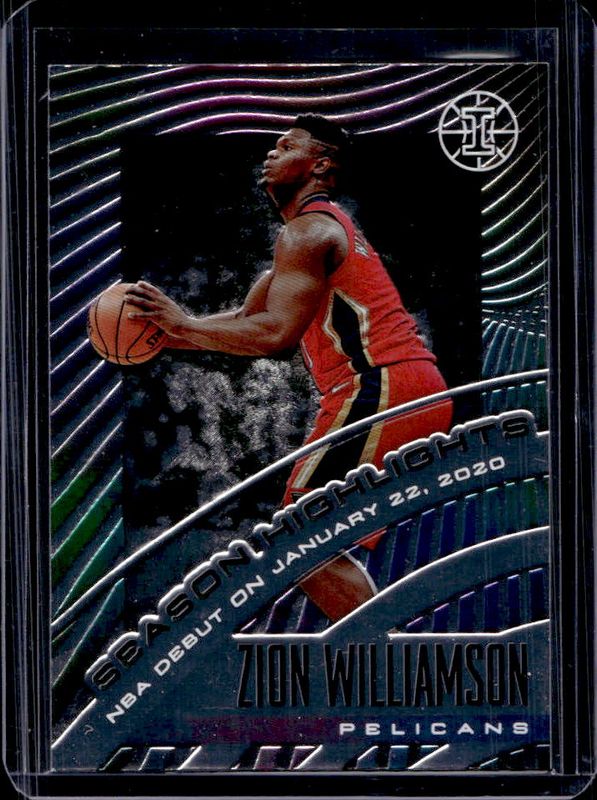 The Zion Williamson 2019 Illusions #5 Season Highlights Rookie card is 1 of 41 Zion Williamson's card variations in the 2019 Illusions set being tracked by Sports Card Investor, including Base, Trophy Collection Bronze, Trophy Collection Emerald, Trophy Collection Orange, and Trophy Collection Pink.